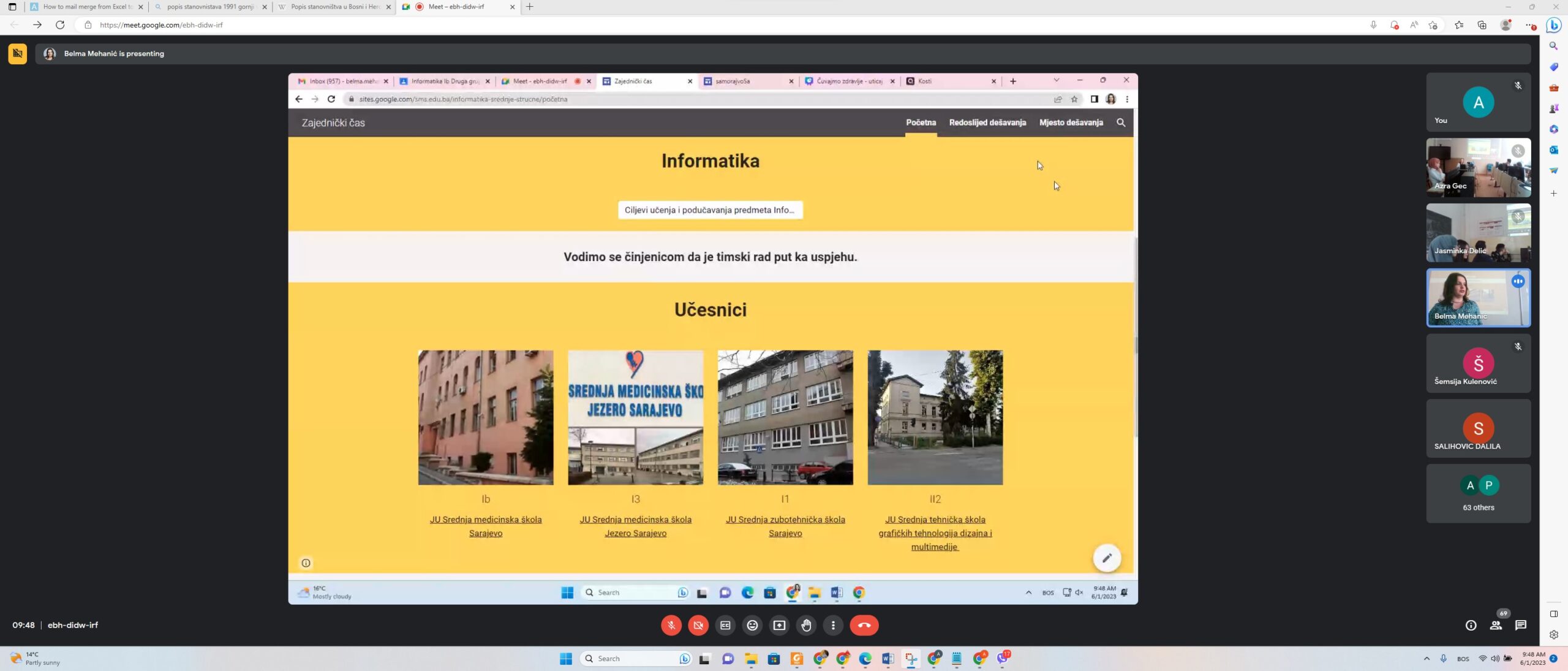 1. 6. 2023. godine održan je zajednički čas, JU Srednja tehnička škola grafičkih tehnologija, dizajna i multimedije (prof. Informatike Jasminka Delić), JU Srednja zubotehnička škola (prof. Anatomije i fiziologije čovjeka dr. Sabrina Beširović, prof. Informatike Šemsija Kulenović), JU Srednja medicinska škola (prof. Anatomije i fiziologije čovjeka dr. Azra Kadrić, prof. Informatike Belma Mehanić) i JU Srednja medicinska škola – Jezero Sarajevo (prof. Anatomije i fiziologije čovjeka dr. Azra Rožajac, prof. Informatike Azra Gec).